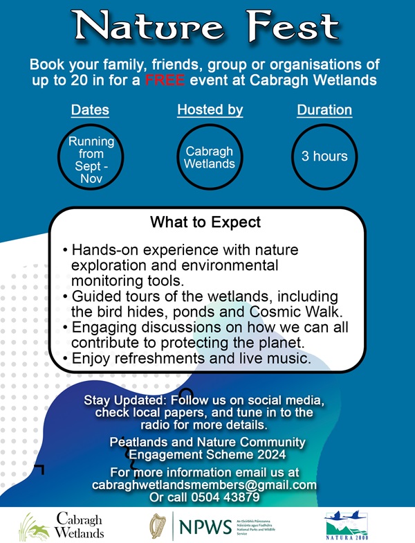 The programme of events is being made possible by a generous grant provided by the National Parks and Wildlife Service under its Peatlands and Natura Community Engagement Scheme 2024.