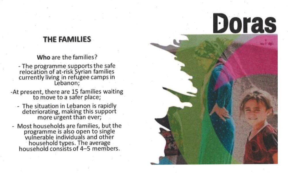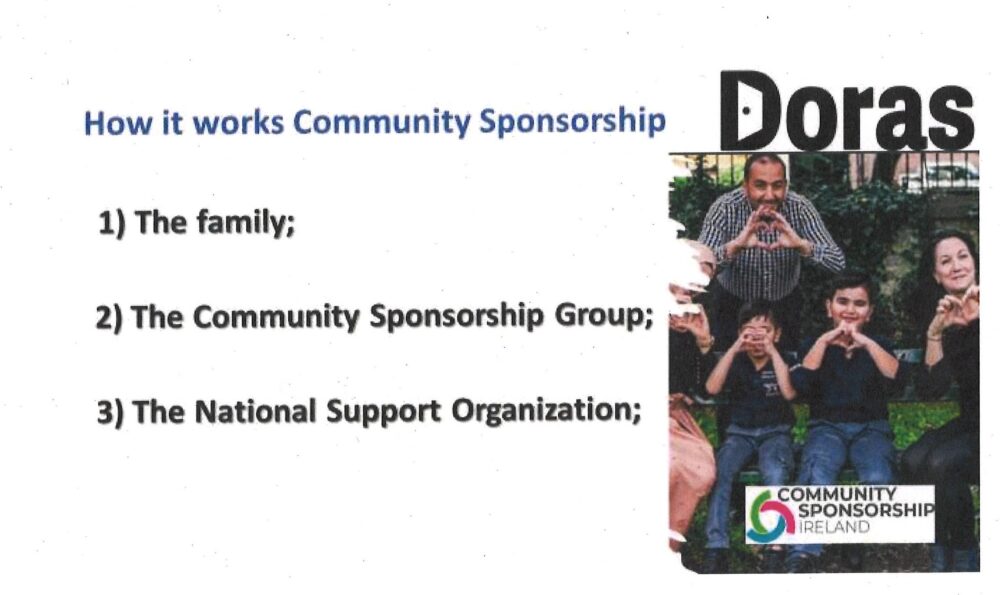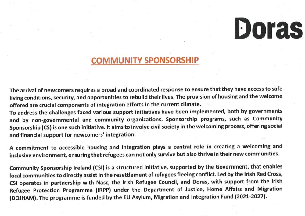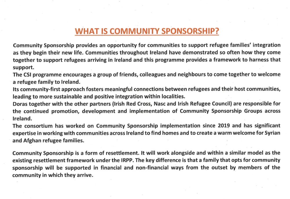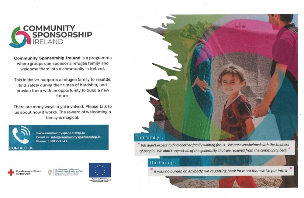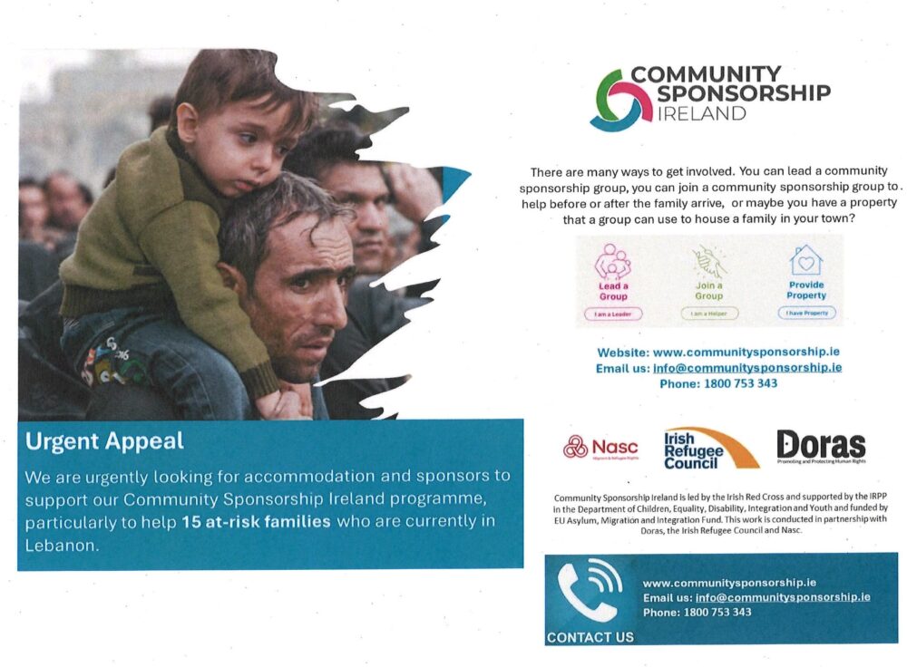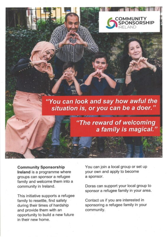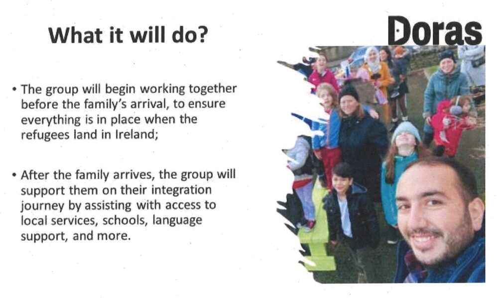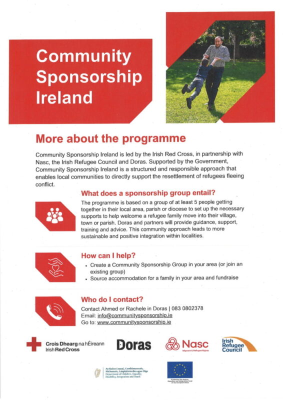 Here is a chance to help people that are suffering, to help a family to relocate, revive, and survive. Please read the following information and if you feel you can offer any help or assistance please contact Jamie Groome on 0858566070. There will be an information evening this October (date to be confirmed) in our Community centre, delivered by the Irish Red Cross and DORAS.