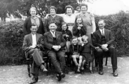 Back: Bridget Loughnane, Jo O’Halloran, Biddy Young (nee O’Halloran), and Mai Gleeson (nee O’Halloran) Front: Paddy O’Halloran, Ned Loughnane, Mary, Annette, Paddy and Eddie Loughnane and Mick O’Halloran
