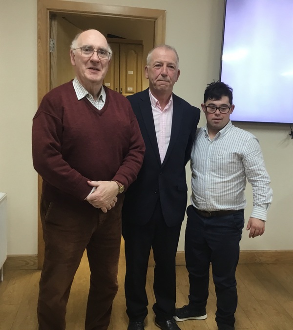 Our photos show our guest speaker of the night, Prof Gerry Boyle, along with his nephew, Diarmuid and Michael Delaney, our society’s chairman. And Michael Delaney presents the proceeds from the event to Eamon Corcoran, who accepted on behalf of ”Ramble with Ronan”